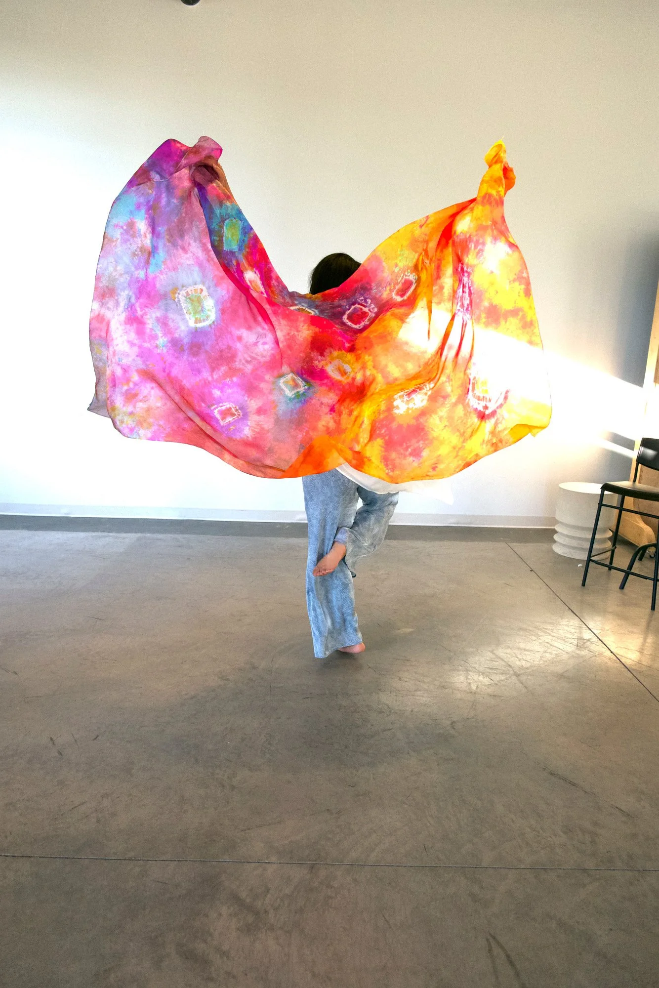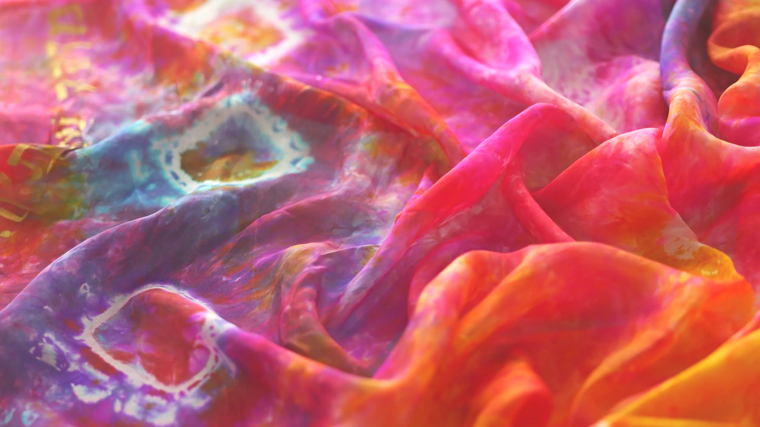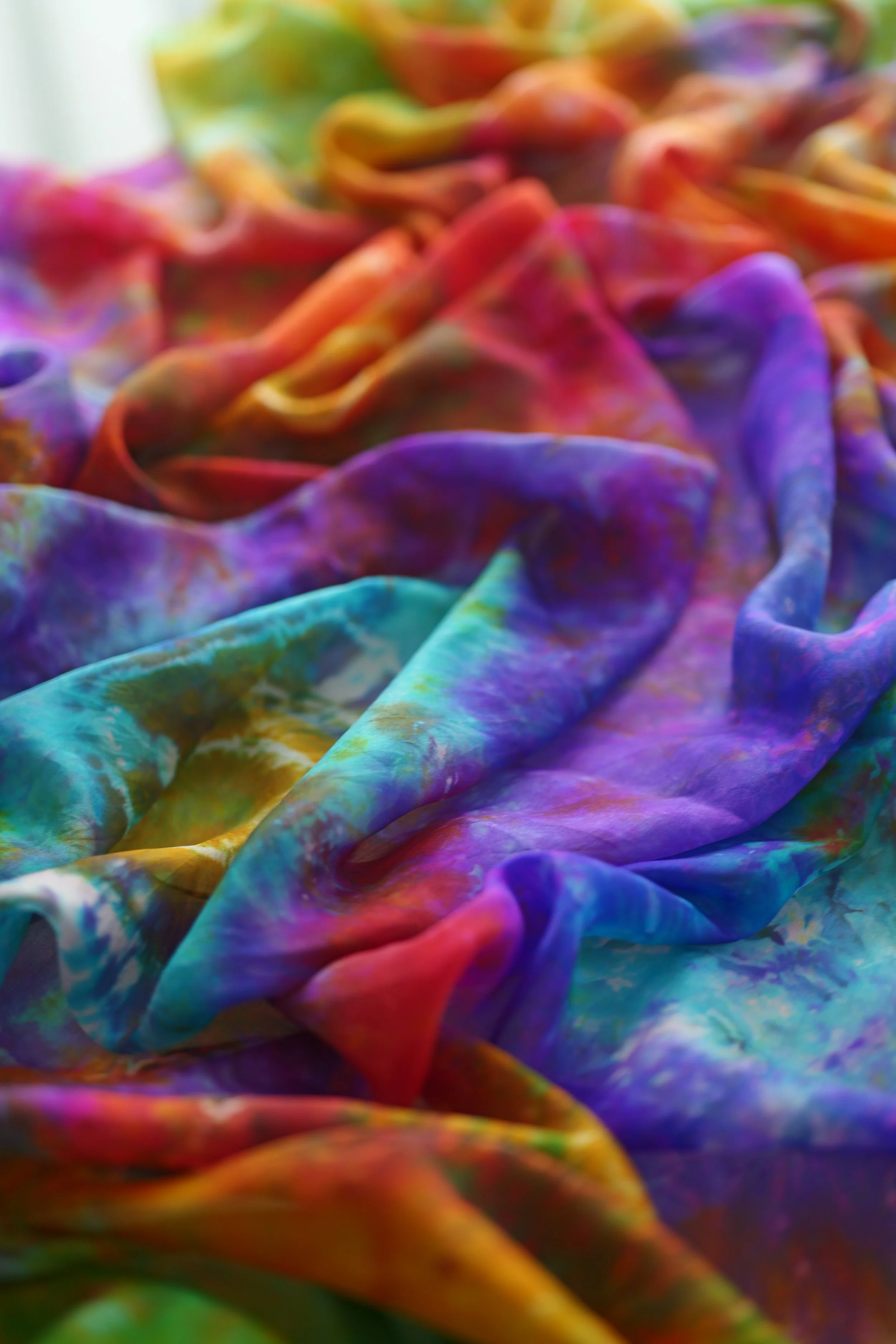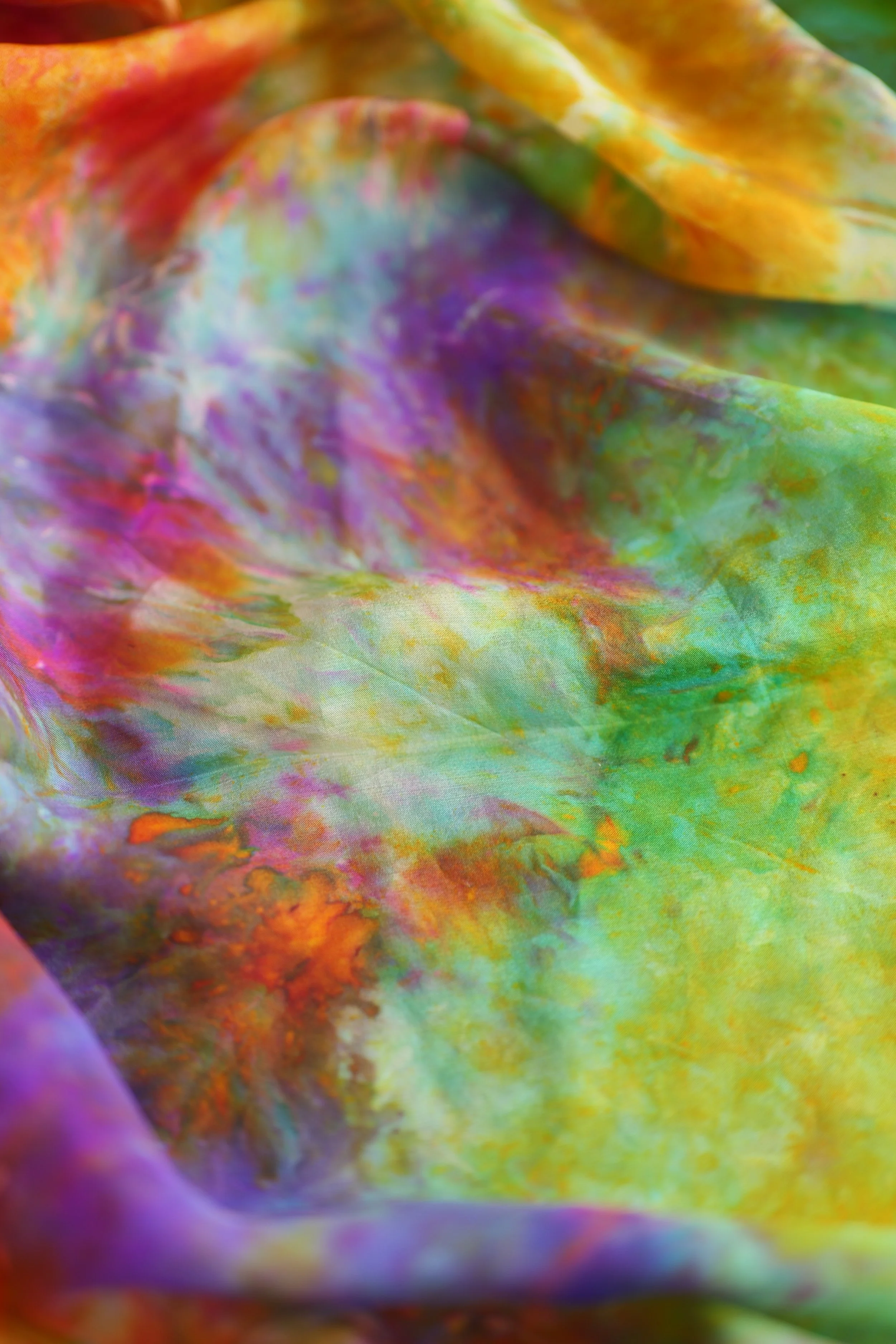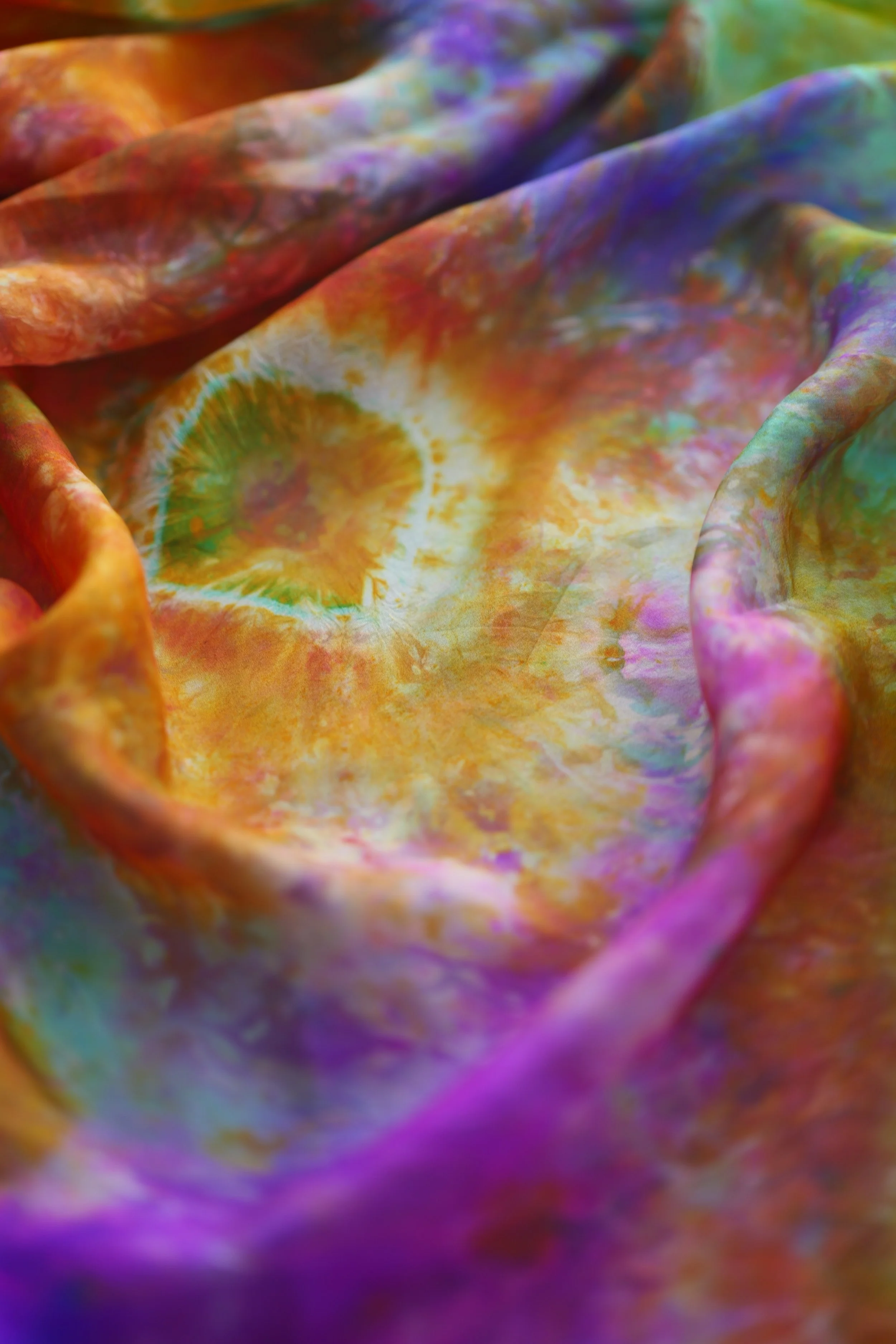 Colorful tie-dye fabric with vibrant swirls of pink, red, orange, yellow, green, blue, and purple, arranged in a loose, textured pattern.
