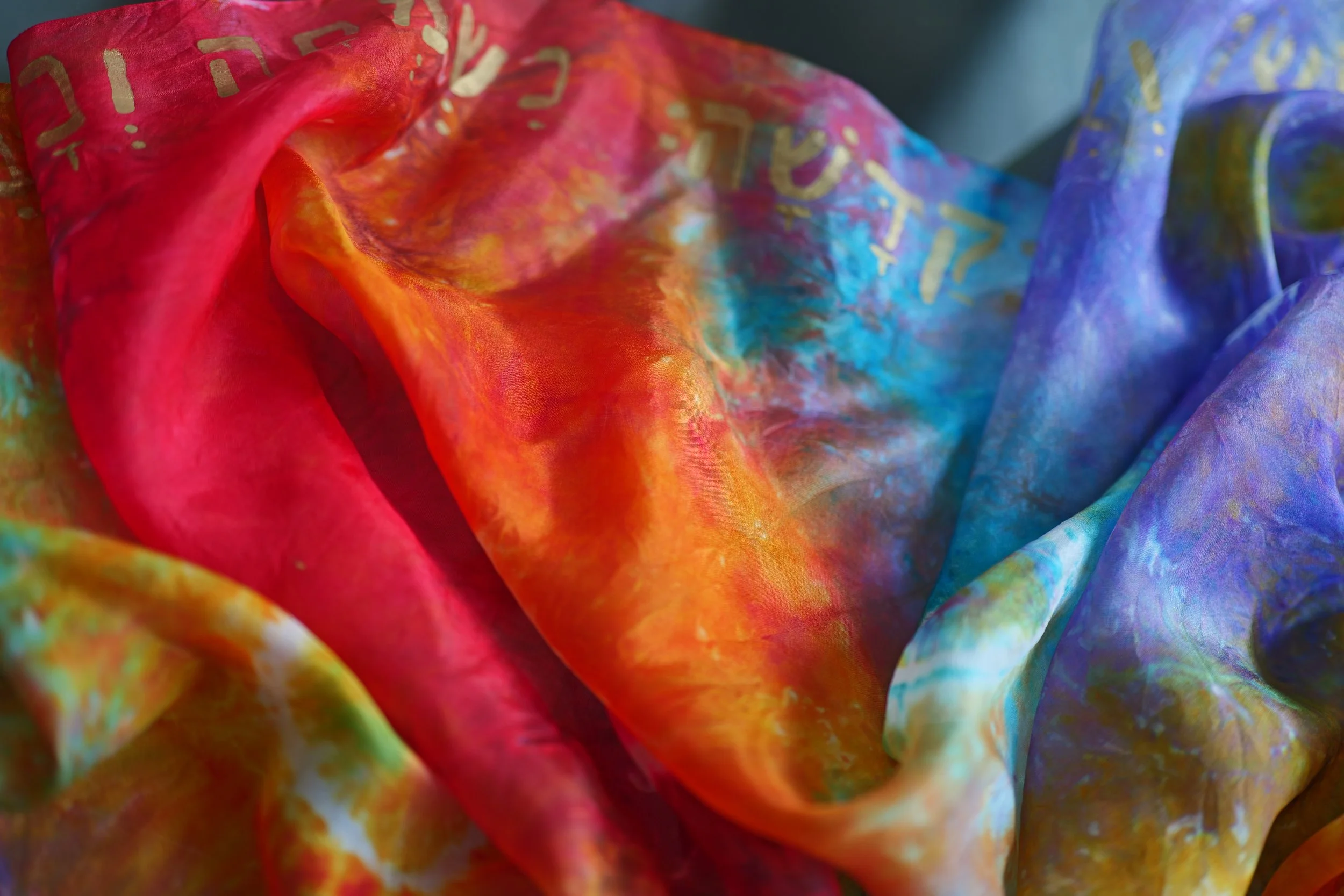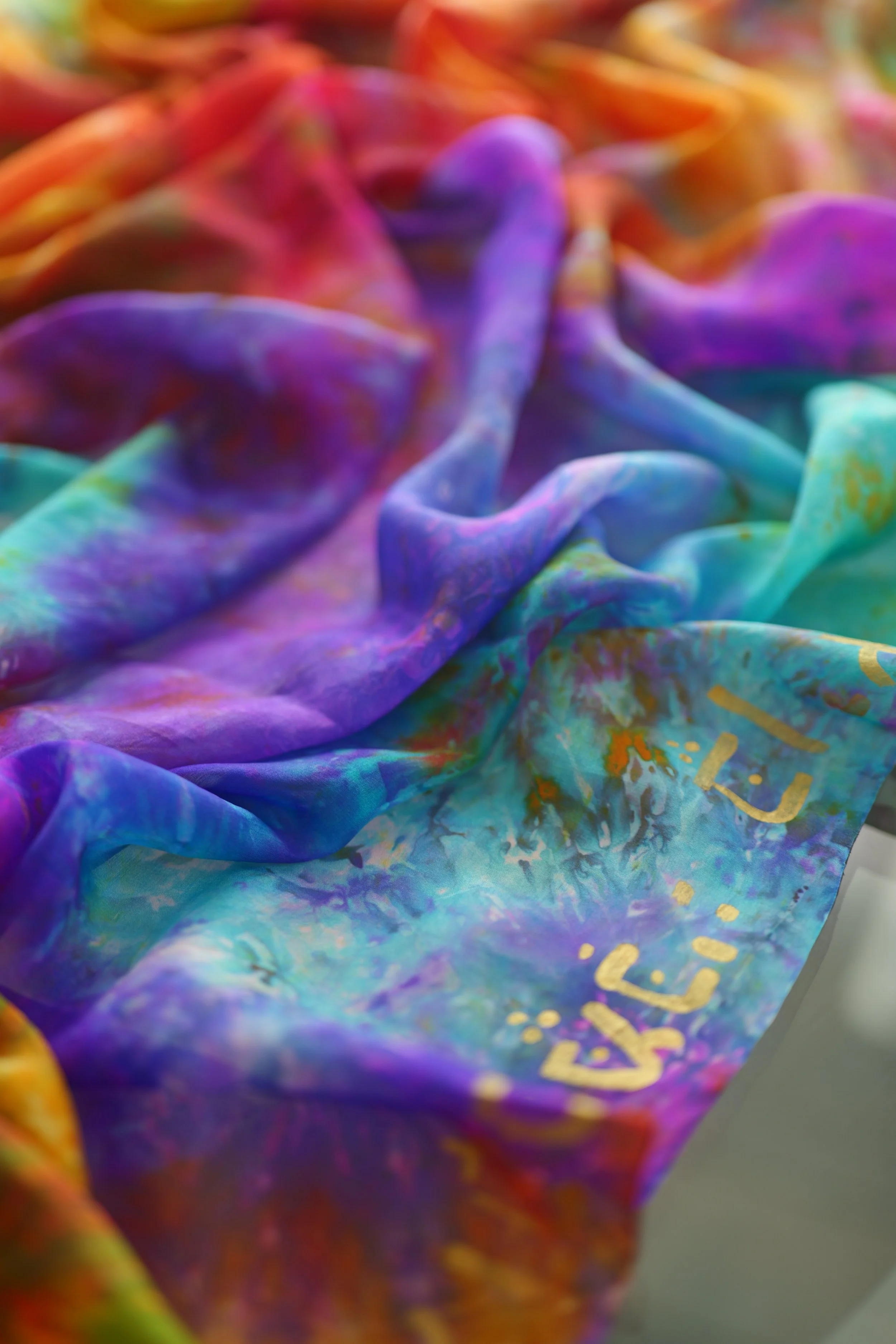 Close-up of a colorful, abstract fabric with vibrant hues of red, orange, yellow, blue, and purple, featuring gold lettering.