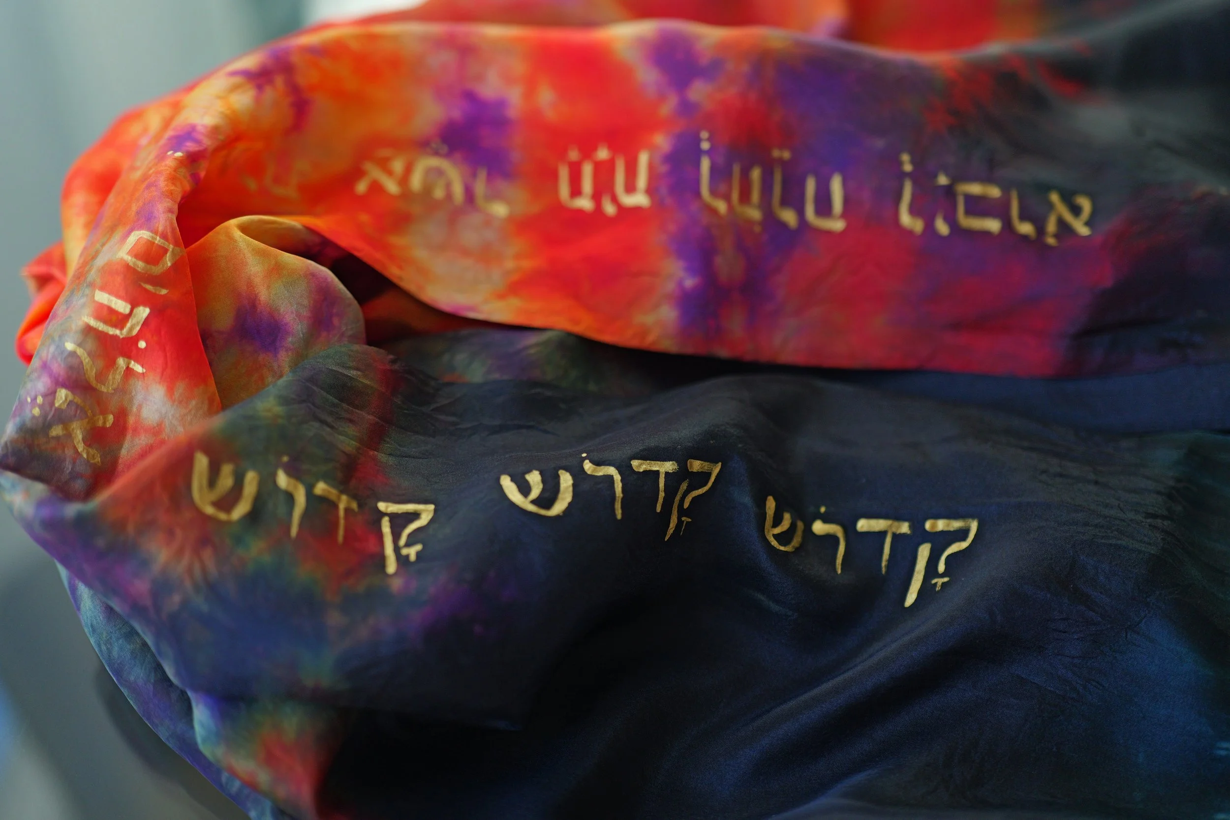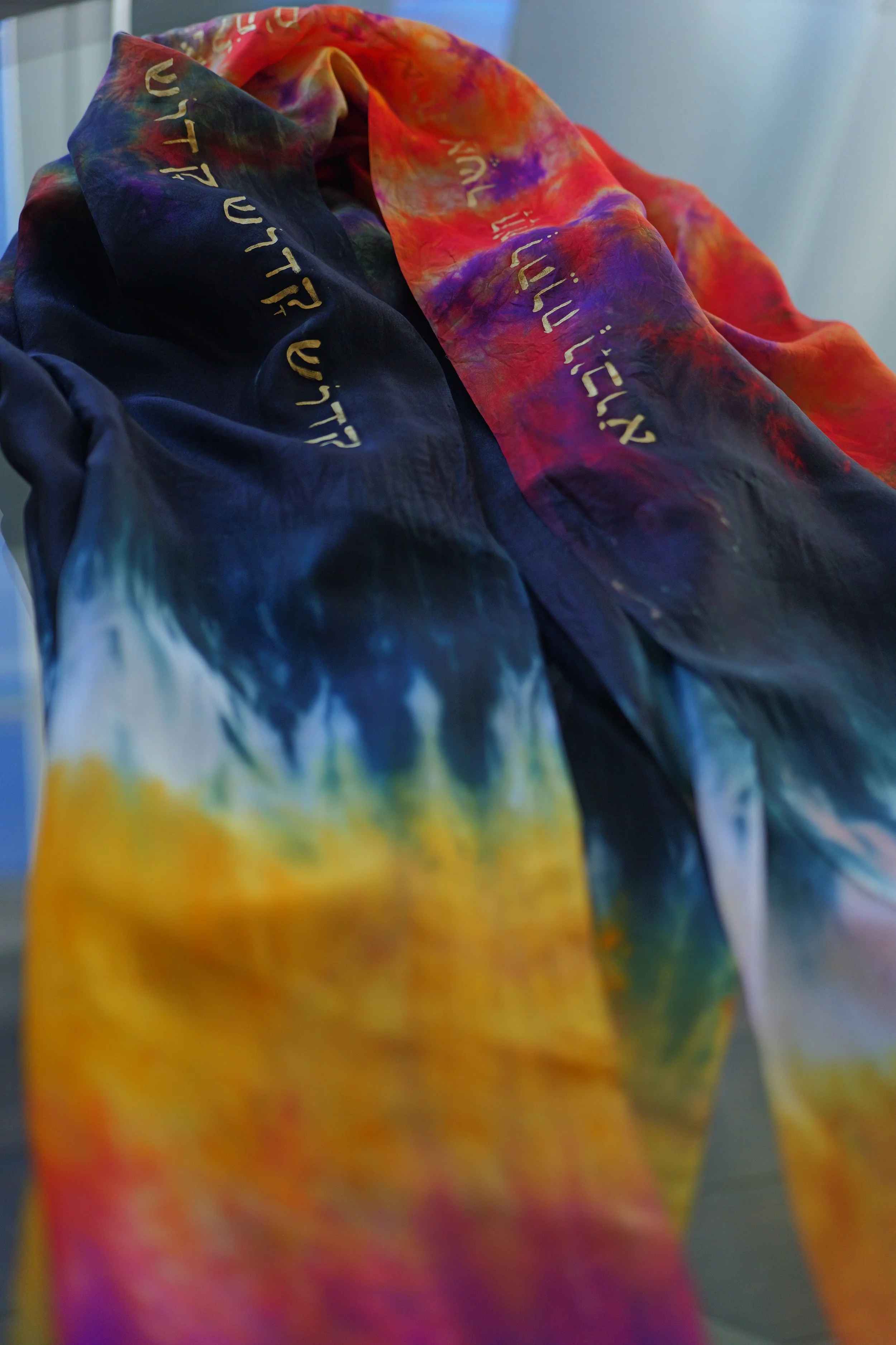 **Care instructions: We do not recommended washing your silk creation as the colors could bleed into one another. Keep silk is a cool dry place to store and prevent the silk from becoming soiled or stained. Best storage method is to simply hang silk on a gentle clothing hook or rack which will protect the silk and minimize wrinkles. A silk or soft storage bag is recommended if traveling with your silk creation, Consistent long exposures or your silk to direct sunlight will cause the colors to fade over time. To remove wrinkles lightly steam silk or iron on medium heat with steam, Iron on reverse side only, avoiding direct heat to gold lettering (can be ironed indirectly on reverse side) .