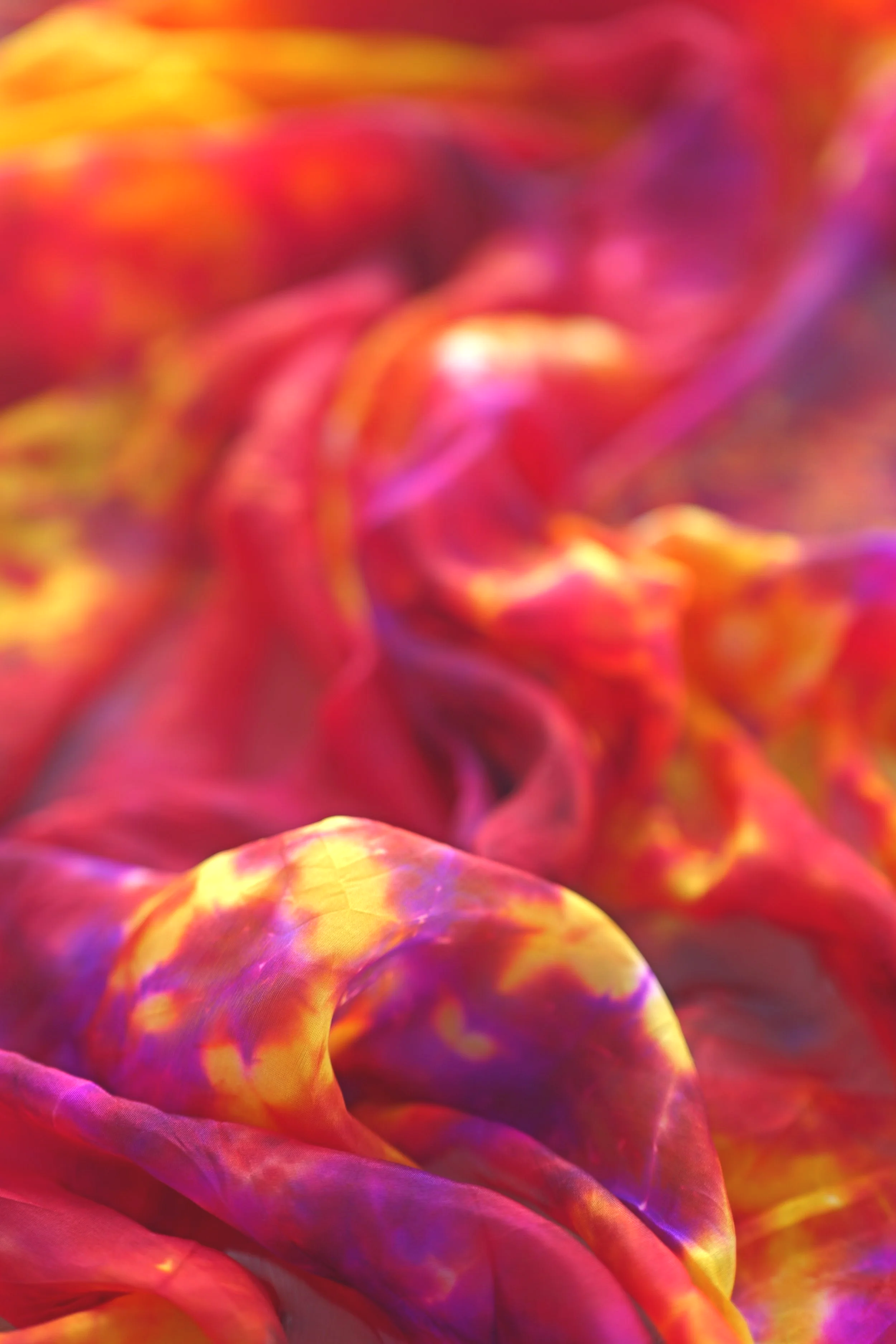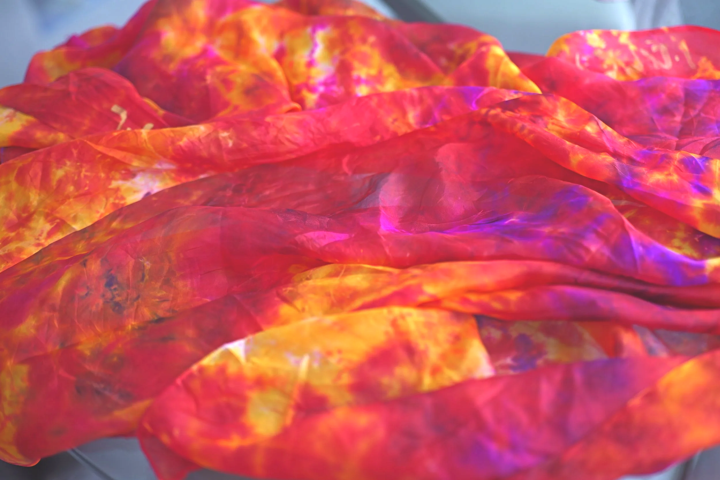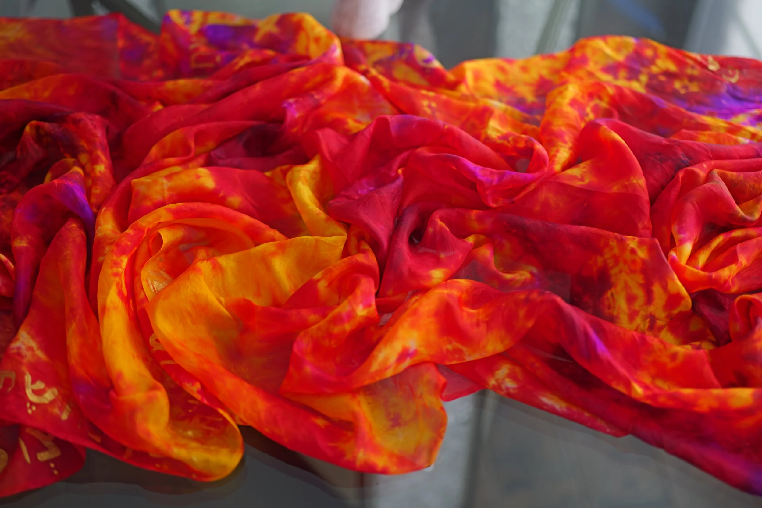 **Care instructions: We do not recommended washing your silk creation as the colors could bleed into one another. Keep silk is a cool dry place to store and prevent the silk from becoming soiled or stained. Best storage method is to simply hang silk on a gentle clothing hook or rack which will protect the silk and minimize wrinkles. A silk or soft storage bag is recommended if traveling with your worship veil. Consistent long exposures or your silk to direct sunlight will cause the colors to fade over time. To remove wrinkles lightly steam silk or iron on medium heat with steam, *Avoiding adding heat to or around any of the gold hand painted symbols or lettering which will cause the lettering to flake away.